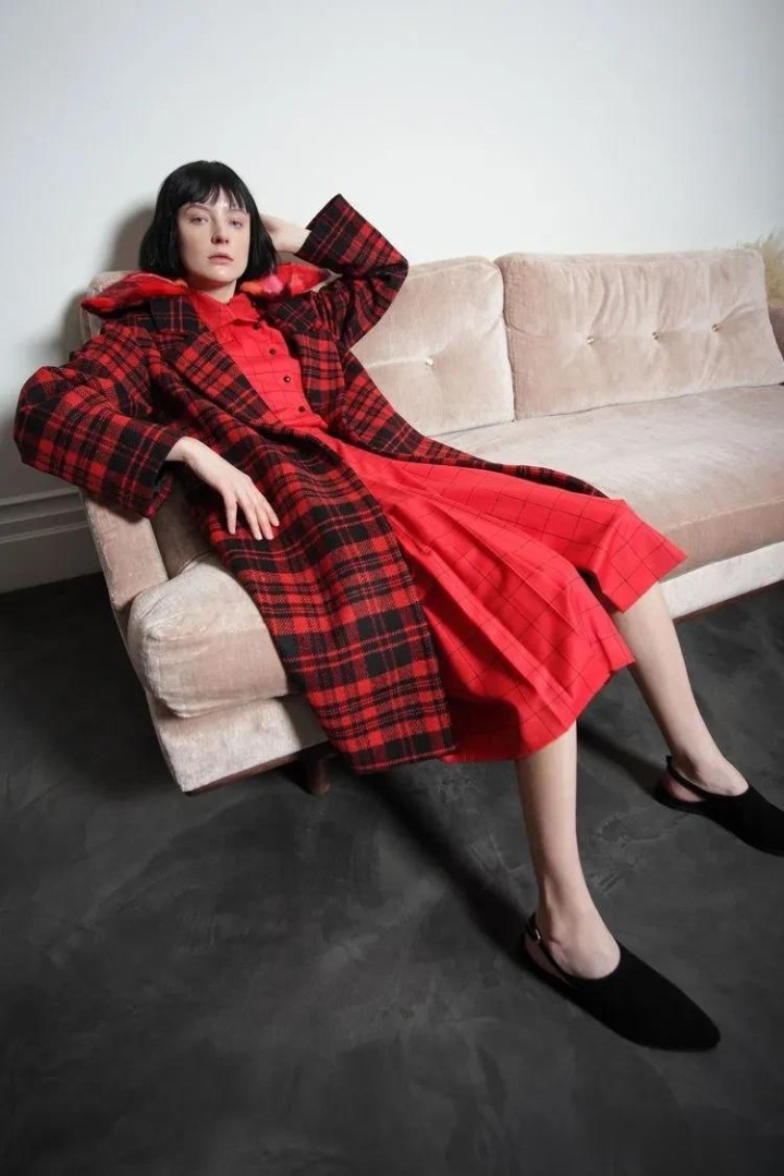 建议:裙子和格纹大衣长度差,